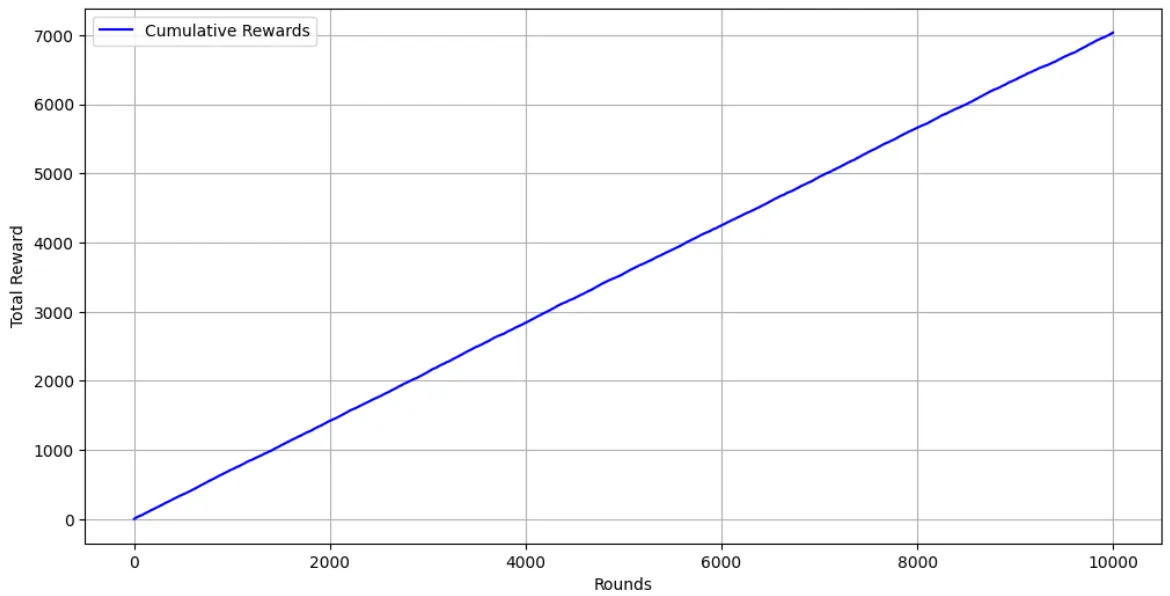 # Run simulationn_rounds = 10000rewards = []ad_selections = []cumulative_rewards = np.zeros(n_rounds)traffic_allocation = np.zeros((n_rounds, n_arms))