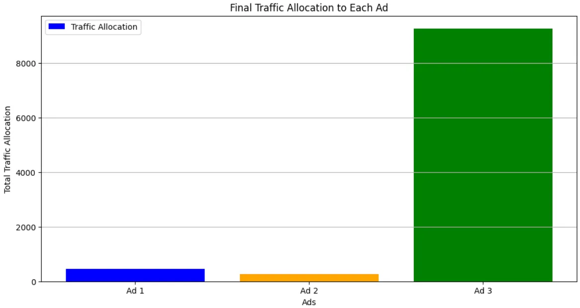 # traffic allocationplt.figure(figsize=(12,6))plt.bar(range(bandit.n_arms), traffic_allocation[-1], label='Traffic Allocation', color=['blue', 'orange', 'green'])plt.xticks(range(bandit.n_arms), [f'Ad {i+1}' for i in range(bandit.n_arms)])plt.title('Final Traffic Allocation to Each Ad')plt.xlabel('Ads')plt.ylabel('Total Traffic Allocation')plt.legend()plt.grid(True, axis='y')Output